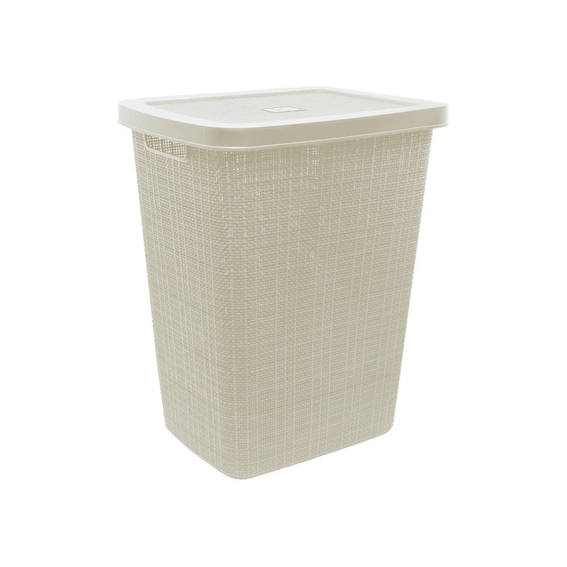 El cesto de ropa contiene un moderno diseño de textura yute en color beige, elaborada en plástico con protección solar UV, el cual lo hace resistente a los rayos solares, a la humedad y al polvo. Es ideal para mantener organizado tu dormitorio o lavandería.